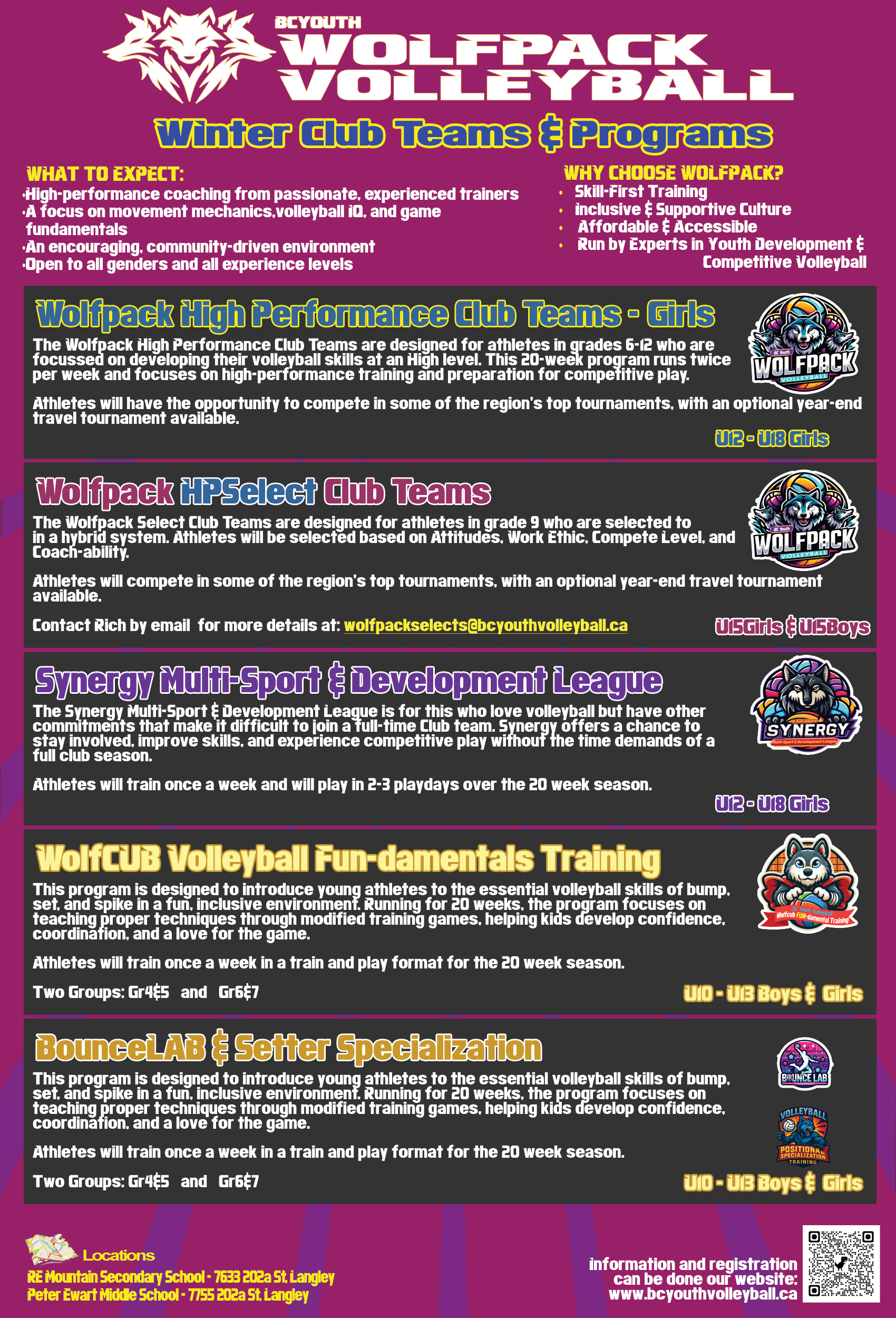 Who Should Join: This program is ideal for athletes who are passionate about volleyball, dedicated to improving their skills, and prepared to commit to the rigors of a high-performance environment. Players will benefit from top-level coaching, advanced training techniques, and the opportunity to compete against some of the best teams in the region. The difference between our Synergy and Wolfpack programs is based on the number of training opportunities per week, and the level of competition that the athletes will compete against. Athletes will be evaluated based on current skill level, potential for development, coach ability, a positive growth mindset and their ability to compete as a team.